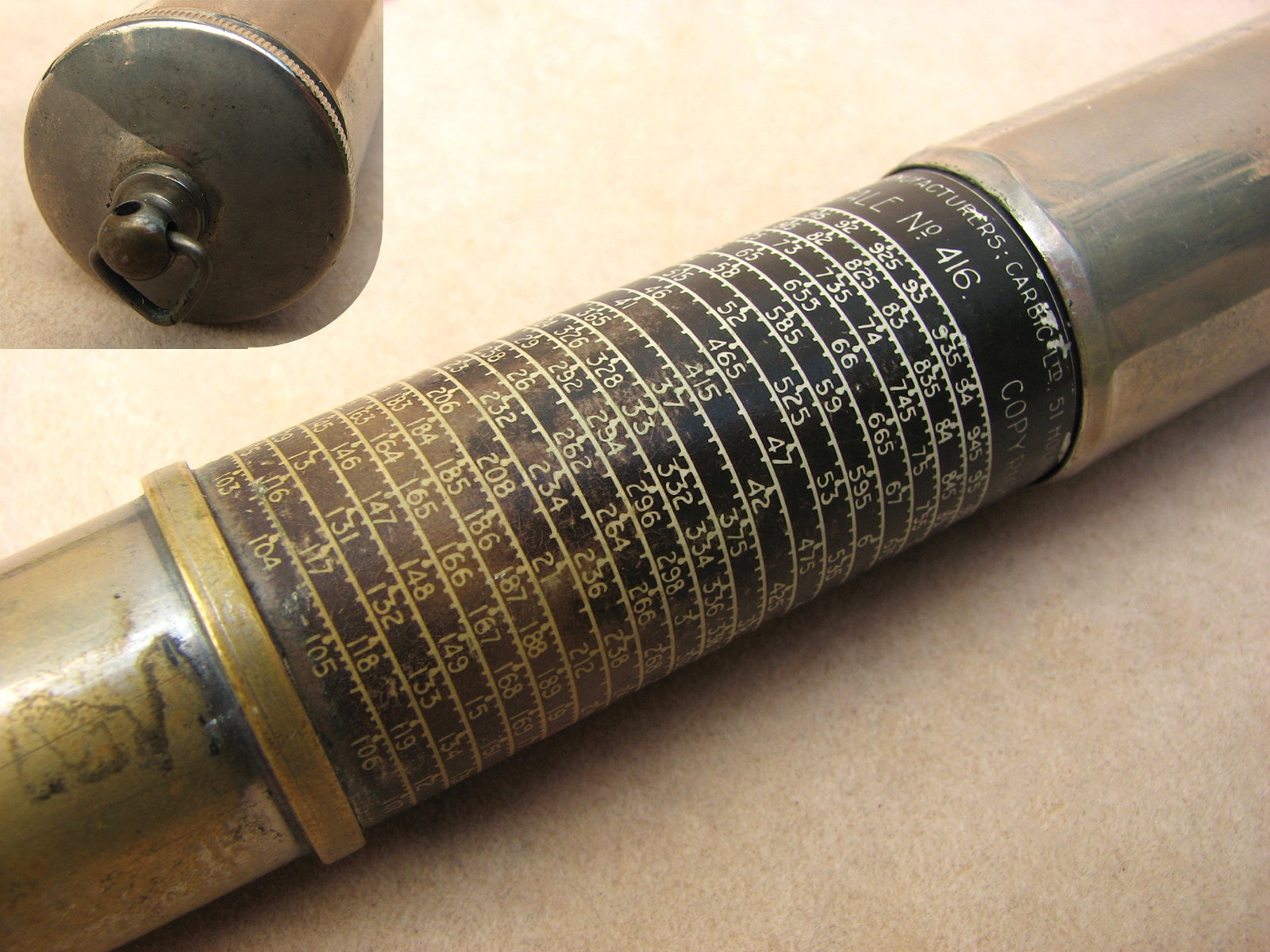 This is a rare example of an early Otis King's cylindrical calculator model 'L' type A, but with 416 and 417 scales, much less common then the later model L's which had 429 and 430 scales.